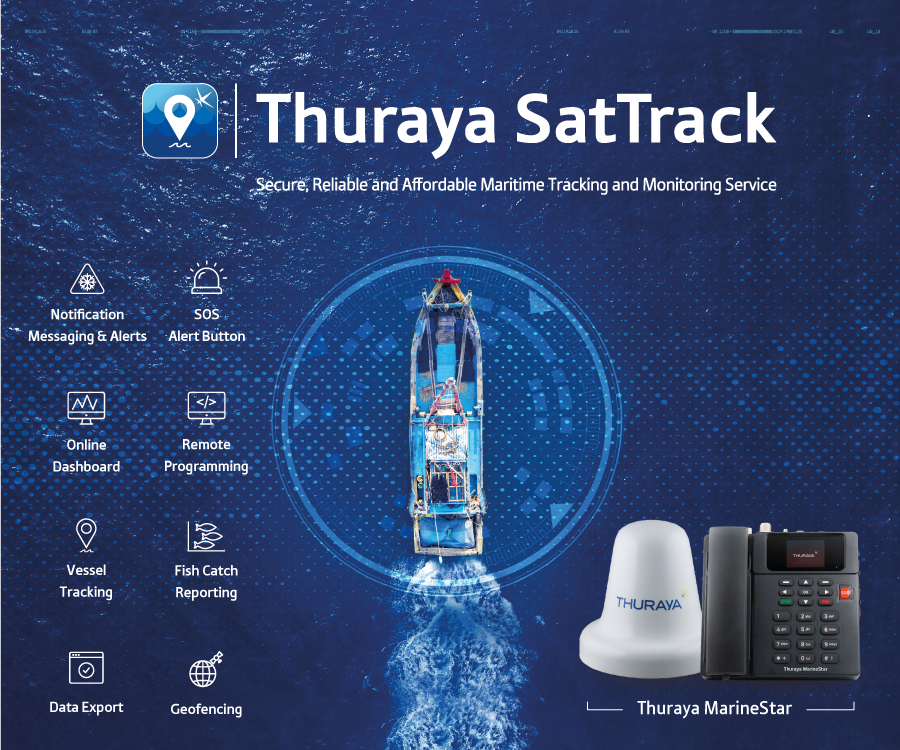 خدمة Thuraya SatTrack هي خدمة تتبع ومراقبة قائمة على الإنترنت مصممة لسفن الصيد المجهزة بحلول الصوت Thuraya MarineStar للتتبع والمراقبة. وهو تطبيق منخفض التكلفة قائم على اشتراك جاهز ومتاح للمستخدمين كجزء من مجموعة الثريا لخدمات النطاق الضيق SeaLite. وتعمل Thuraya SatTrack على تسهيل ممارسات الصيد المستدامة وتحسين سلامة الطاقم ورفاهيته بالإضافة إلى رؤية الأسطول وإدارته بشكل فوري.