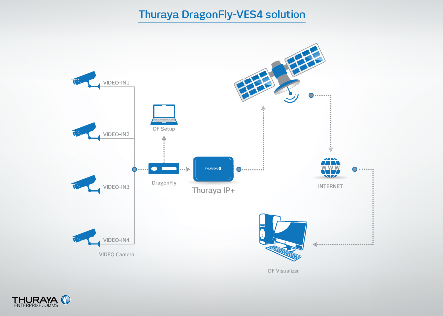 Thuraya’s extensive coverage map allows the DragonFly solution to transmit multiple videos with low bit rates. The VES4 can store multiple videos and will feed them to a remote site - ideal for those working in challenging environments where mission-critical information is of the utmost importance. DragonFly-VES4 is a video surveillance solution that transmits compressed, high-quality video footage. The DragonFly solution helps crews working in Enterprise organizations who rely on remote video surveillance.